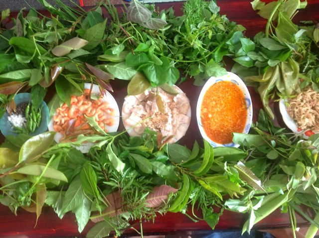 Ngồi vào mâm, người phục vụ sẽ giới thiệu đến bạn từng loại lá trong món gỏi. Đọt lá lộc vừng, sâm đất, hồng ngọc, sung, lá lốt, trâm, diếp cá, chó đẻ răng cưa, quế, thuyền đất… Mỗi loại lại có một tác dụng chữa bệnh khác nhau. Gỏi lá ăn kèm thịt heo ba chỉ, tôm rang, da heo thái mỏng trộn bột nếp rang.