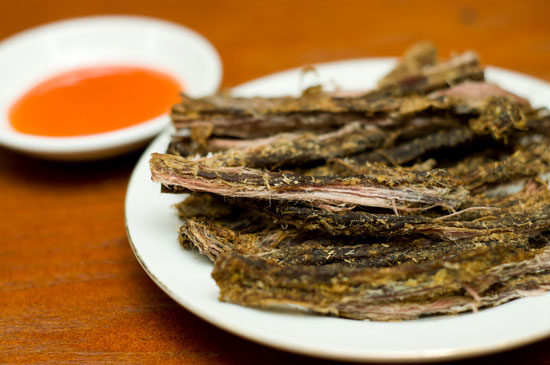Đứng đầu bảng có lẽ là món nai khô. Nai khô không béo ngậy như nai nướng. Miếng nai khô dài cỡ 5cm ướp cả tiếng đồng hồ với xì dầu, sả, muối, đường, ớt mè trắng và ngũ vị hương rồi nướng trên than hoa, sau đó dùng sống dao dần cho miếng thịt mềm ra rồi mới dọn lên bàn cho khách.